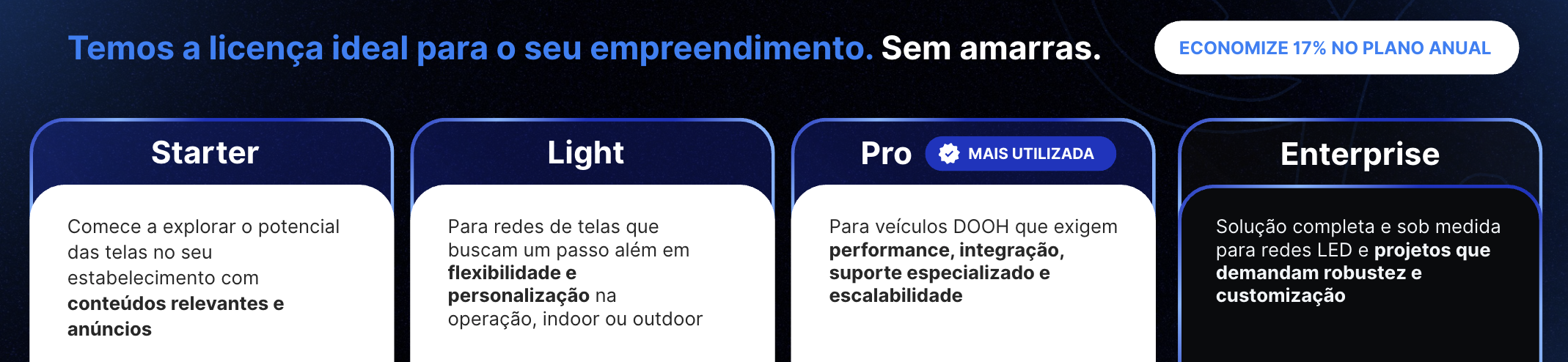Você sabia que temos mais modelos de licenças na plataforma? Cada rede tem seu tamanho e seu tempo, e a adMooH nasceu para democratizar o DOOH. Então, para atender a todo, surgem o plano Starter (pra quem está dando os primeiros passos) e o plano Enterprise (pra quem já joga no modo gigante). Escolha o que mais combina com seu momento!